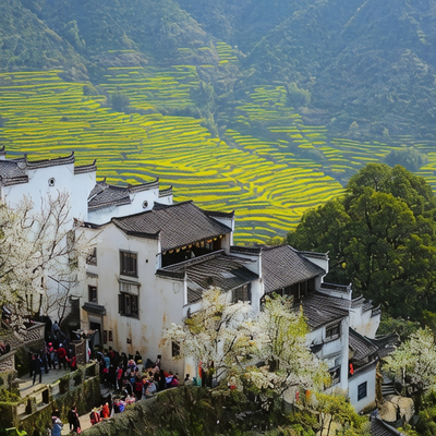 阳春三月,婺源篁岭景区数万亩层层叠叠的梯田上油菜花盛开,粉红的桃花、雪白的梨花点缀其中,是一副优美的水墨油画,在这里,你可以与大自然融为一体,与花海亲密接触。