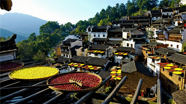 挂在山崖上的篁岭古村,地无三尺平,数百年来,村民早已习惯用平和的心态与崎岖的地形“交流”,绘就出了一处“晒秋人家”风情画。