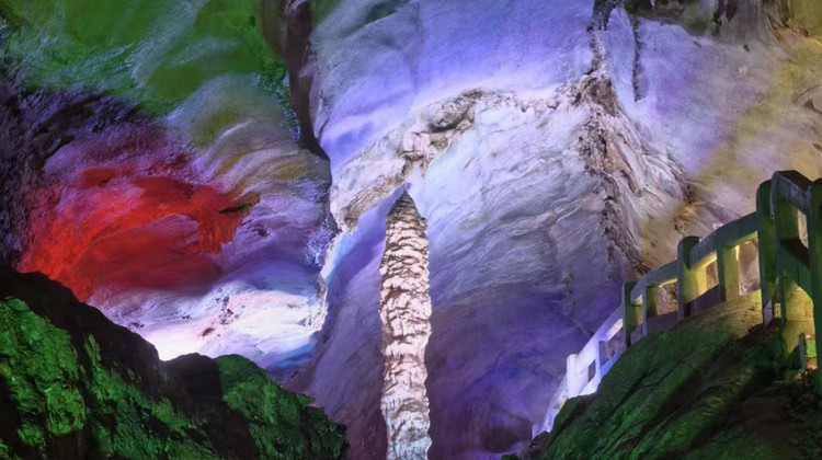 婺源灵岩洞景区是婺源北线的景点之一,由36个溶洞组成,目前游人只能参观涵虚洞和莲华洞,洞内除了流水冲击石灰岩形成的石芽、石林景观,还可以欣赏到岳飞、宗泽等历代名人的题墨。景区周边一些古村落、名树古木也值得一看。涵虚洞分为七层,入口位于第6层。游览完6、7两层后,再逐层步行往下游览,后到达底层的地下河,坐皮艇出洞。洞中第五层的“菩提古树”是洞内有代表性的景观,生得像一棵需要多人合抱的菩提树,也是整个涵虚洞的顶梁柱。前方不远的“宗泽遗墨”是岳飞的老师宗泽当年游览婺源灵岩洞景区时所题,是婺源灵岩洞景区引以为傲的景观之一。四五层中间,则是一副天崩地塌的景象,四周是陡峭的岩壁,下方是坠落的巨石,好似岩体崩塌形成,场面壮观。下面几层的景致显得更为细腻,“金山银山”的同池水却有金银两色,水中闪闪发光的矿物质沉积,以及“金山银山”这个诱人的名字,让人印象深刻。开阔层叠的“仙人田”好像浑然天成的梯田,其中一处水滴一圈一圈沉积成花瓣一样的形状,极像一朵硕大的“牡丹”在田中绽放,大概是洞内唯美的石景。前方洞顶壁上,生出莲花状的石芽,不仅外形优美,这样倒着生长的石芽本身就十分罕见。一路往下,走到下层的地下河,就能乘小皮艇出洞了。泛舟河上,可慢慢欣赏四周的岩壁,好像在经历一场探险。由涵虚洞出来,需要再往上爬一段山才能到达莲华洞。由于比较远,景色和涵虚洞有些重复,因此游人较少。里面出名的景观是“老君炼丹”。景区山脚下的石城村口有一片古树林,古枫、银杏、香榧树、红豆杉、楠木、槐树等等,有的树龄已达千年。可以在此逛古村,看古树。周边也有小店可以解决吃住问题。
