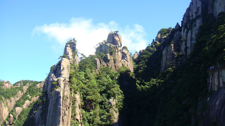 从东部金沙索道上山的游人较多,上来即是精华的南清园。大约半小时走到“巨蟒出山”,左边不远便是“东方女神”。往西过玉皇顶、“三龙出海”走上阳光海岸的高空栈道,可俯瞰下面的田园风光。阳光海岸和后面的三清福地-西海岸正好串成一个环形旅游线路,三清福地的道教古建筑群以三清宫为核心,依据“先天八卦图”的方位布局,十分精巧。其中,风雷塔是许多游客争相合影的地方。在此休整一会儿,继续往前便是西海岸的高空栈道。栈道靠近三清宫的地方,“猴王献宝”也是山中的奇石之一。下午正好在栈道上看三清山云海和晚霞。