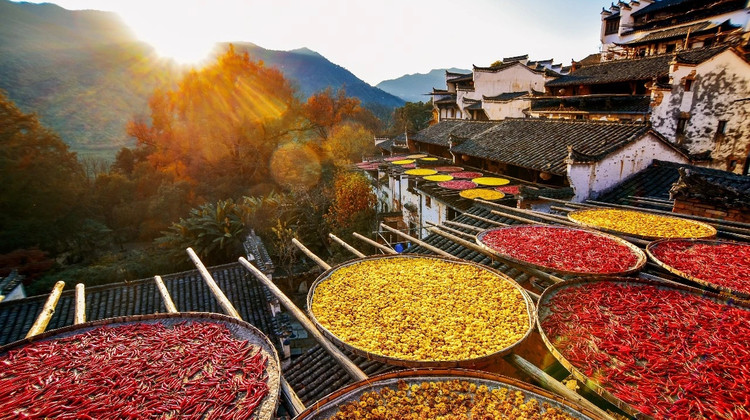立秋一到,篁岭古村就成了一个天地晒场。来晒秋人家赏红枫,欣赏屋顶晒秋,枫林尽染,体验民风民俗,手摇风车、套南瓜等,感受晒秋人家的乡愁韵味。