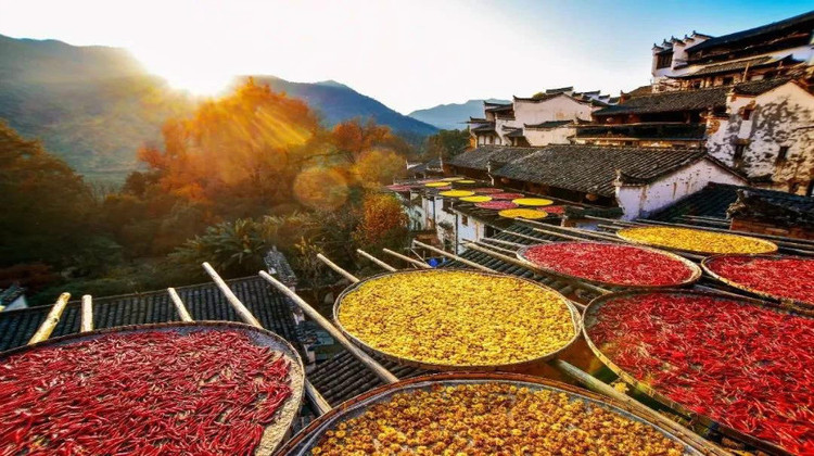 登晒秋观景台,观特有的篁岭“晒秋”农俗特色景观,数十栋古老徽派民居在百米落差的岭谷错落排布,家家凿窗采光,户户支架晒物。村民们用眺窗为画板,支架为画笔,晒匾为调色盘,春晒水笋、蕨菜;秋晒红辣椒、稻谷黄豆…就这样成就了一幅幅民俗风情杰作,一年四季延绵有序。