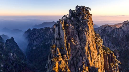 黄山四绝中,云海居首,由此可见,云海是装扮这个“人间仙境”的神奇化妆师。而日出时形成的“彩色云海”,更是好看。日出的阳光照在翻腾的云海上,似是金色的海浪濒临于眼前,变化无穷,令人应接不暇。