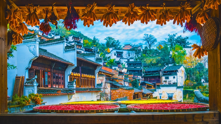 挂在山崖上的篁岭古村,地无三尺平,数百年来,村民早已习惯用平和的心态与崎岖的地形“交流”,绘就出了一处“晒秋人家”风情画。