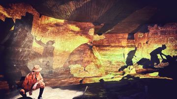 2.探谜现场:面积12600平方米,是以原始石窟为舞台,以声光电科技为手段,以原创故事为核心,以动态观影为方式的大型沉浸式洞窟展演。