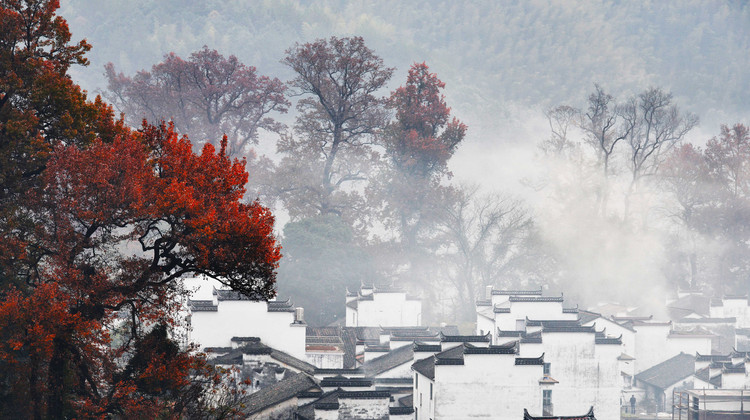 深秋的的婺源也是美不胜收,十一月中下旬是赏红叶黄叶、观晨雾的理想时节。大山深处的村落被薄雾笼罩,大片的红枫和银杏映衬着乡村的白墙黑瓦,在雾中若隐若现,煞是迷人。石城、婺源篁岭景区、晓鳙村、思溪延村等村落均是赏秋景的好去处。在古村婺源篁岭景区还可见到民俗景观“晒秋”,家家户户的屋顶上晒着红辣椒、稻谷等农作物,登高远望一片壮美的红黄色。