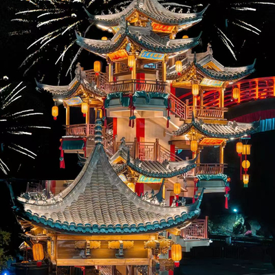 到了晚上,这里将上演隆重庄严的众妙阁秀,现代科技灯光与古建筑的结合如梦似幻,给人带来极具视觉冲击力的体验。