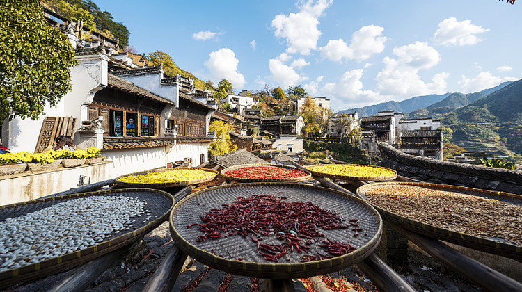 挂在山崖上的篁岭古村,地无三尺平,数百年来,村民早已习惯用平和的心态与崎岖的地形“交流”,绘就出了一处“晒秋人家”风情画。