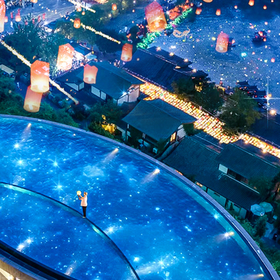 日落后的半小时迎来了黄金的光线,晚上7点左右整个度假区的灯会全部亮起,这个时候天色还没有完全黑,是出片子的好时刻。长街上五颜六色的纸灯笼亮全部起了灯,顿时华灯璀璨古韵十足。趁人少,可以在长街的灯笼下拍摄提灯夜游的照片,尽量仰拍,这样可以拍到足够多的灯笼也可以避开灯下的行人。