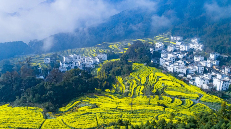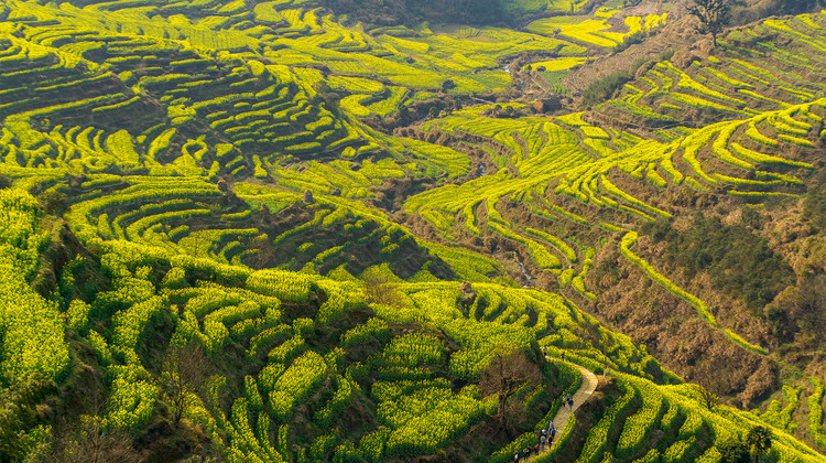 阳春三月,婺源篁岭景区数万亩层层叠叠的梯田上油菜花盛开,粉红的桃花、雪白的梨花点缀其中,是一副优美的水墨油画,在这里,你可以与大自然融为一体,与花海亲密接触。