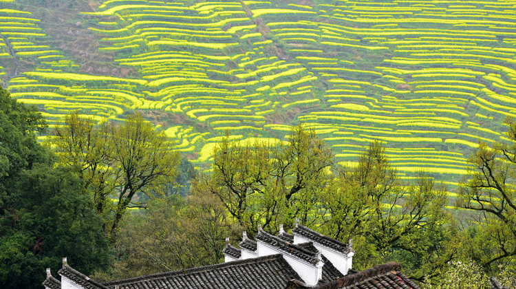 三月底,婺源篁岭景区二期高岭梯田花海接力上线,由于海拔落差大、温度低,加上晚熟油菜花品种,使得花期较晚,二期花海可持续至4月中旬。