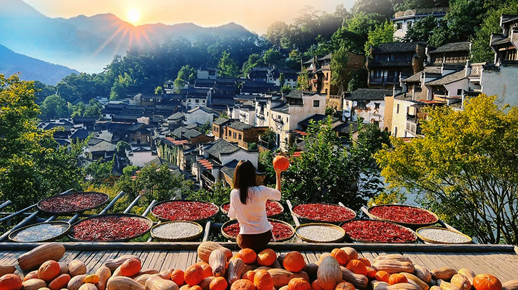 立秋一到,篁岭古村就成了一个天地晒场。来晒秋人家赏红枫,欣赏屋顶晒秋,枫林尽染,体验民风民俗,手摇风车、套南瓜等,感受晒秋人家的乡愁韵味。