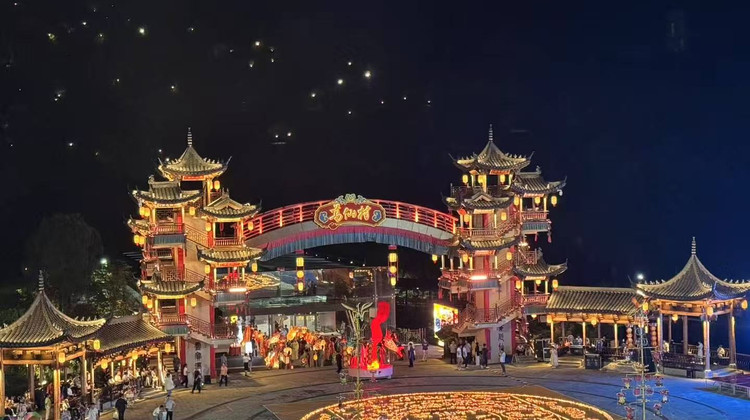夜幕低垂,华灯初上,浪漫的气息笼罩着整个山谷,隐世悬崖之上的灯火阑珊,山林溪水相伴,享受仙谷夜色。