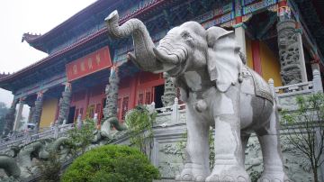 华严宝殿是旃檀林的三大宝殿里居中的一座,殿中央端坐高14.8米的华严三圣,分别为释迦佛和文殊、普贤二菩萨。区别其他寺院的雄狮,此殿外有两尊体量庞大的汉白玉大象,让人产生“法门龙象”的联想。
