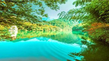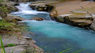 这条被称作芙蓉谷的峡谷,纵深四公里,群峰嵯峨,原始森林茂密。行至谷中,但见许多硕大如星的冰川潭砾交错溪中。每隔数米、数十米远便有一彩色池潭。池潭直径十米左右,深约五、六米。波光丽影、斑澜纷呈,娇艳如盛开的芙蓉。潭中或有巨石,半露水面,形似奇禽异兽。有的池潭边还有小瀑垂悬,流玉飞珠,飘雾香甜醉人。池潭均为巨砾环抱,石上片片凹凸冰川磨面,恰似片片花瓣,与池中丽水相映衬,构成一幅幅美妙的水景幻境。