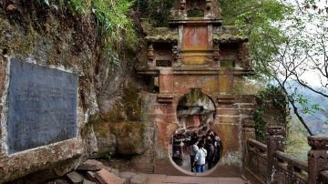 前山主要看摩崖石刻,以真仙洞府尤为壮观,峭壁上洞穴遍布,顶上写有“天开神秀”四个大字,洞穴中供着各路神仙,从崖顶不停有珠泉滴落进崖下的清池。然后走到月华街。走到街的尽头,穿过门洞是葫芦形状的石坊“小壶天”,到达一个石窟,仔细看石窟顶上,有远古时代的恐龙踩出的足迹。从月华街爬到高峰约需半小时。
