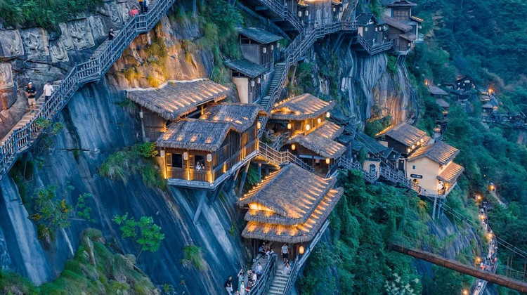 简介:投资超50亿打造的“悬崖仙侠小镇”,融合赣家夯土建筑与峡谷风光,以悬崖民宿、古风市集和夜景灯光秀为特色,被称为“现实版仙侠世界”。