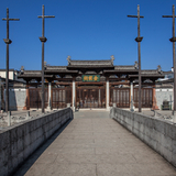 整个建筑群沿中轴线对称布局,由南至北依次为:牌坊、三源桥、棂门、戟门等古祠设施。建筑整体的风格层次清晰,内部的雕刻也规整大气,在祠宇内的碑亭中还保留着珍贵的堂记碑文。