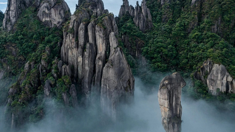 巨蟒出山是一座象形石柱,经大自然长期的风化与重力作用而形成,峰壁峭立,顶部稍平,颈部略细,就像一条破山而出的巨蟒,可谓是大自然的鬼斧神工。它与东方女神观遥遥相对,从金沙索道(东部索道)上山后到南清园景区游玩途中便可欣赏到。