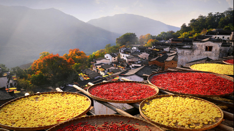 挂在山崖上的篁岭古村,地无三尺平,数百年来,村民早已习惯用平和的心态与崎岖的地形“交流”,绘就出了一处“晒秋人家”风情画。