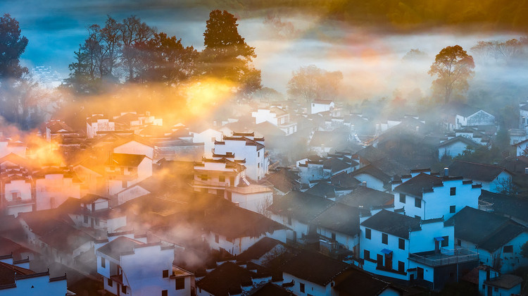 石城是一座山的称呼,在婺源县西北的古坦乡(现合并入大鄣山乡)境内,婺源旅游地图上叫石城山,山脚下就是灵岩国家森林公园。山上分布有两个村庄,分别叫程村与戴村。戴村与程村隔着一个小山坡,村后有古枫点缀,两个村庄的秋色各具特色,拍完石城的日出晨曦后可以到村里转转。