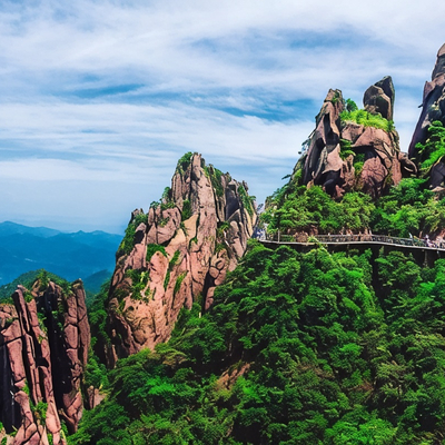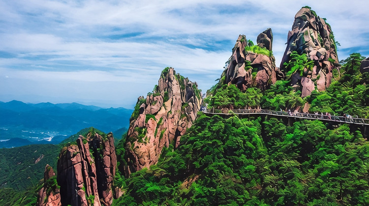 三清山风景区位于上饶市东北部,有“小黄山”之称,因三清山-玉京峰、玉虚、玉华峰三座山峰挺拔屹立,神似道教玉清、上清、太清三位尊神列坐在山巅之上而得名。这里是道教名山,景色也有几分仙气,能看漂亮的云海日出,欣赏山间惟妙惟肖的奇石,还能走上高空栈道赏景。