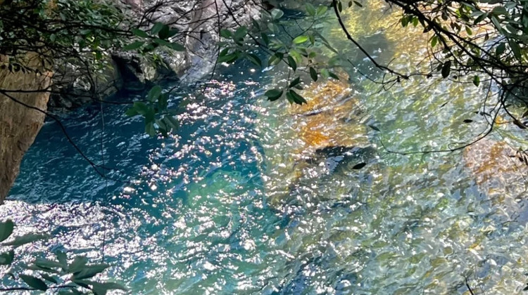黄龙潭幽深、静谧,古木掩映的峡谷间,一道溪涧穿绕石垒而下,银色瀑布冲击成暗绿色的深潭。静坐潭边,听古道落叶、宿鸟鸣涧,自然升起远离尘世、超凡脱俗之感。