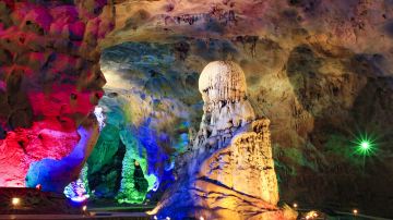 灵岩洞是婺源北线的景点之一,由36个溶洞组成,目前游人只能参观涵虚洞和莲华洞,洞内除了流水冲击石灰岩形成的石芽、石林景观,还可以欣赏到岳飞、宗泽等历代名人的题墨。景区周边一些古村落、名树古木也值得一看。涵虚洞分为七层,入口位于第6层。游览完6、7两层后,再逐层步行往下游览,后到达底层的地下河,坐皮艇出洞。洞中第五层的“菩提古树”是洞内有代表性的景观,生得像一棵需要多人合抱的菩提树,也是整个涵虚洞的顶梁柱。前方不远的“宗泽遗墨”是岳飞的老师宗泽当年游览灵岩洞时所题,是灵岩洞引以为傲的景观之一。四五层中间,则是一副天崩地塌的景象,四周是陡峭的岩壁,下方是坠落的巨石,好似岩体崩塌形成,场面壮观。下面几层的景致显得更为细腻,“金山银山”的同池水却有金银两色,水中闪闪发光的矿物质沉积,以及“金山银山”这个诱人的名字,让人印象深刻。开阔层叠的“仙人田”好像浑然天成的梯田,其中一处水滴一圈一圈沉积成花瓣一样的形状,极像一朵硕大的“牡丹”在田中绽放,大概是洞内唯美的石景。前方洞顶壁上,生出莲花状的石芽,不仅外形优美,这样倒着生长的石芽本身就十分罕见。一路往下,走到下层的地下河,就能乘小皮艇出洞了。泛舟河上,可慢慢欣赏四周的岩壁,好像在经历一场探险。由涵虚洞出来,需要再往上爬一段山才能到达莲华洞。由于比较远,景色和涵虚洞有些重复,因此游人较少。里面出名的景观是“老君炼丹”。景区山脚下的石城村口有一片古树林,古枫、银杏、香榧树、红豆杉、楠木、槐树等等,有的树龄已达千年。可以在此逛古村,看古树。周边也有小店可以解决吃住问题。