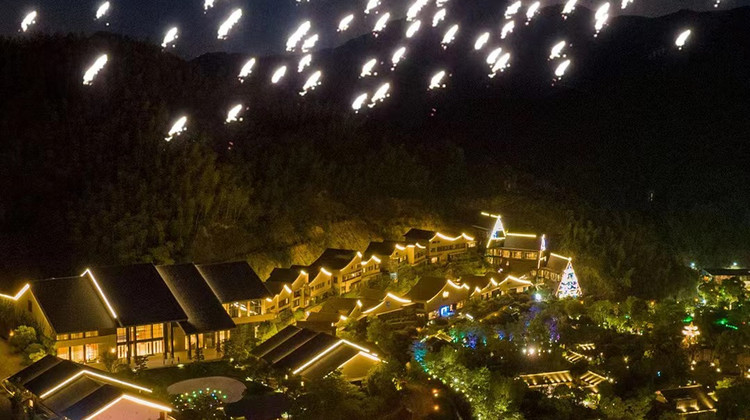 夜幕低垂,华灯初上,浪漫的气息笼罩着整个山谷,隐世悬崖之上的灯火阑珊,山林溪水相伴,享受仙谷夜色。