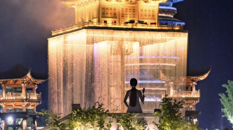 水幕倾泻而下,夜晚灯光亮起