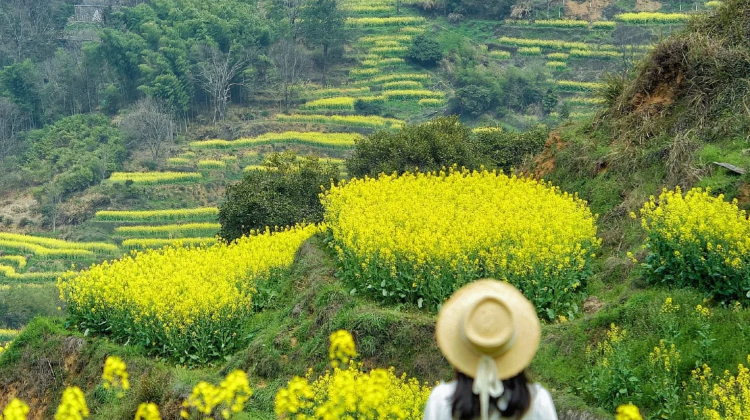 阳春三月,婺源篁岭景区数万亩层层叠叠的梯田上油菜花盛开,粉红的桃花、雪白的梨花点缀其中,是一副优美的水墨油画,在这里,你可以与大自然融为一体,与花海亲密接触。