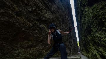 过了山顶顺着“北线下山”的指示牌走,依旧是几乎垂直的下山路,陡且窄的地方得背过身倒退着往下。站在山上看下曲曲折折的陡阶,看着就挺惊心动魄的。下山路上有一段峡谷是没有光线的,不过这段并不长。