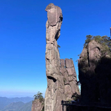巨蟒出山是一座象形石柱,经大自然长期的风化与重力作用而形成,峰壁峭立,顶部稍平,颈部略细,就像一条破山而出的巨蟒,可谓是大自然的鬼斧神工。它与东方女神观遥遥相对,从金沙索道(东部索道)上山后到南清园景区游玩途中便可欣赏到。