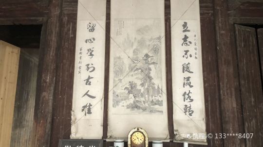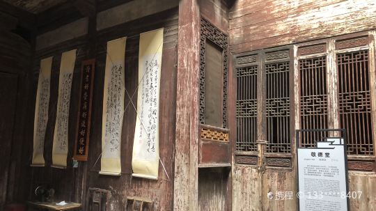 向东走,过前边溪,东岸的敬爱堂始建于明万历年间,清乾隆年间重建,是村中现存面积较大的祠堂。敬爱堂以前是胡氏家族议事、举办婚事、教斥不肖子孙的场所。屋内悬挂的大大的“孝”字让人印象深刻,“孝”上的“土”字右半边像作揖的人,左半边像猴,意思是守孝道方为人,反之就如猢狲一般。