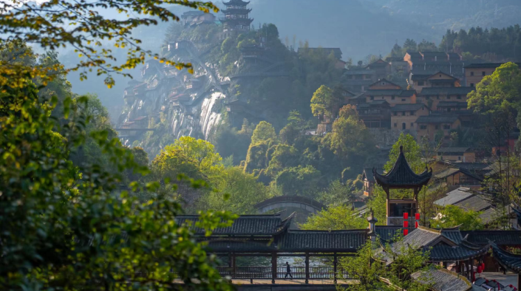 古镇坐落在山谷之中,四周群峰环抱,整个古镇南踞象山,北卧狮山,瑶河穿镇而过,形成山水萦绕的地理环境,让古镇更显宁静清澈。