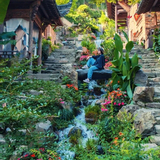 婺源篁岭景区-水街又名花溪水街,顾名思义沿着潺潺叠水的溪流,以鲜花装扮一条“坡面上的街市”。是篁岭景区除古村天街外,又一条特色的商业娱乐街。