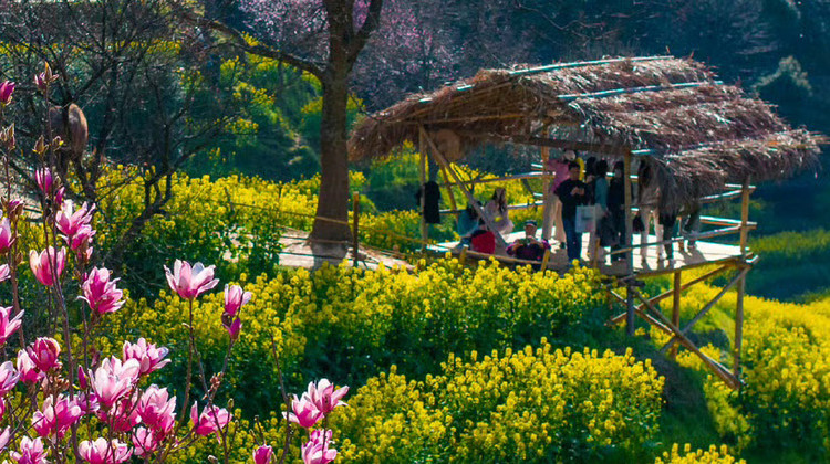 阳春三月,婺源篁岭景区数万亩层层叠叠的梯田上油菜花盛开,粉红的桃花、雪白的梨花点缀其中,是一副优美的水墨油画,在这里,你可以与大自然融为一体,与花海亲密接触。