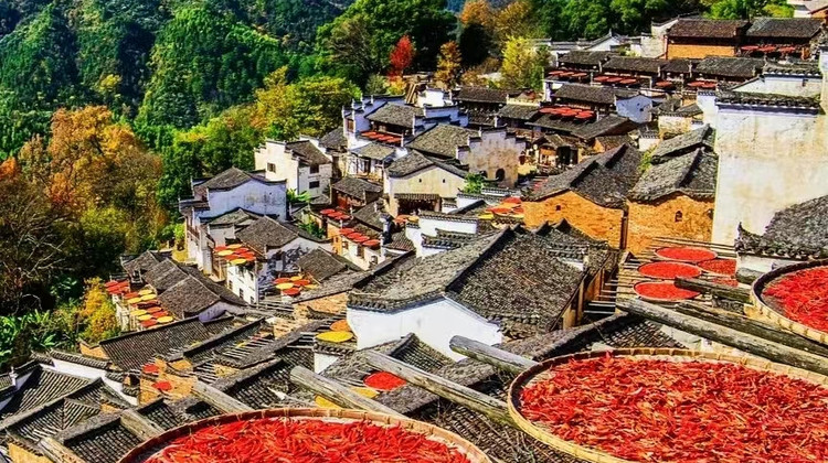 立秋一到,篁岭古村就成了一个天地晒场。来晒秋人家赏红枫,欣赏屋顶晒秋,枫林尽染,体验民风民俗,手摇风车、套南瓜等,感受晒秋人家的乡愁韵味。