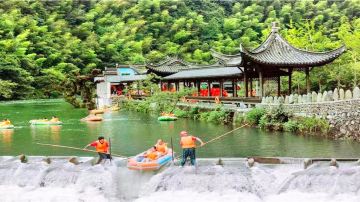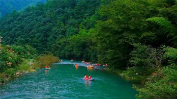 夹溪河漂流全程乘皮筏顺流而下,两岸风景秀丽,群山环绕,悬崖壁立,林木繁茂,竹海茫茫,茶园连绵。险峰、奇石、蓝天、白云倒映,水浅处清澈见底、水深处如翡翠碧玉,鱼虾嬉戏水其中,“荡舟清波上、人在画中游”的美妙遐想您会油然而生。一路漂来山鸟鸣翠,心旷神怡。一路佳景美不胜收。