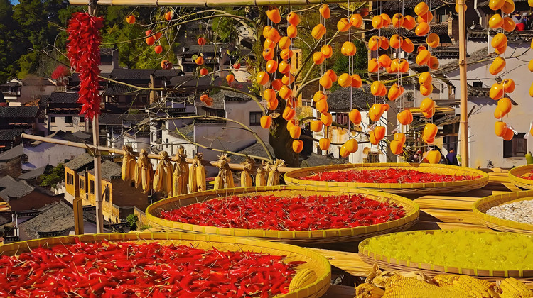 挂在山崖上的篁岭古村,地无三尺平,数百年来,村民早已习惯用平和的心态与崎岖的地形“交流”,绘就出了一处“晒秋人家”风情画。