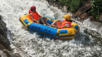 这里原始峡谷中的漂流是游人挑战自我的一项运动,首尾总落差近298米,拥有s型回旋弯道,分上下两段水道。这里中段水道长,相对平缓;上、下两段水道,落差相对集中,急转曲折,起伏跌荡。漂流全程急流与水潭相缀,互为映照,互为依接,陡的地方逼仄,缓的地方从容,急缓有致,起落有度。漂流途中从这些大大小小的石块缝中穿过,流水哗哗响,还有不少小瀑冲下,溅起的水珠的阳光下发出颤动的亮光。