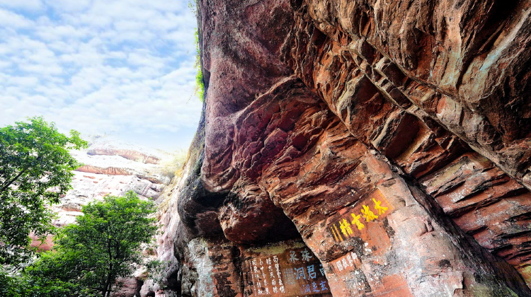 到“爱字石”,一块平坦的石头上写有一个很大的红色“爱”字,情侣可以在此拍照。“爱字石”再往里走一点,在不起眼的山壁边两块巨石夹着一块块圆圆的石头,名“炼丹台”,据说摸一摸能带来桃花运。这一路上你还能找一找写有不同字体的99个“爱”字的石碑。