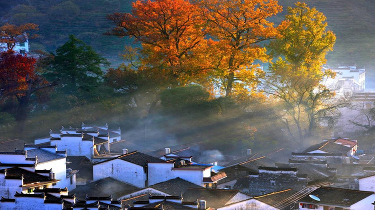 石城是一座山的称呼,在婺源县西北的古坦乡(现合并入大鄣山乡)境内,婺源旅游地图上叫石城山,山脚下就是灵岩国家森林公园。山上分布有两个村庄,分别叫程村与戴村。戴村与程村隔着一个小山坡,村后有古枫点缀,两个村庄的秋色各具特色,拍完石城的日出晨曦后可以到村里转转。