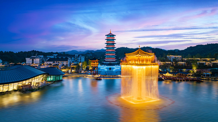 非遗打铁花 观赏地点:金水阁水上舞台烟花秀/烟花瀑布观赏地点:五显湖金阁演出前租汉服体验,夜游古色古香徽市街