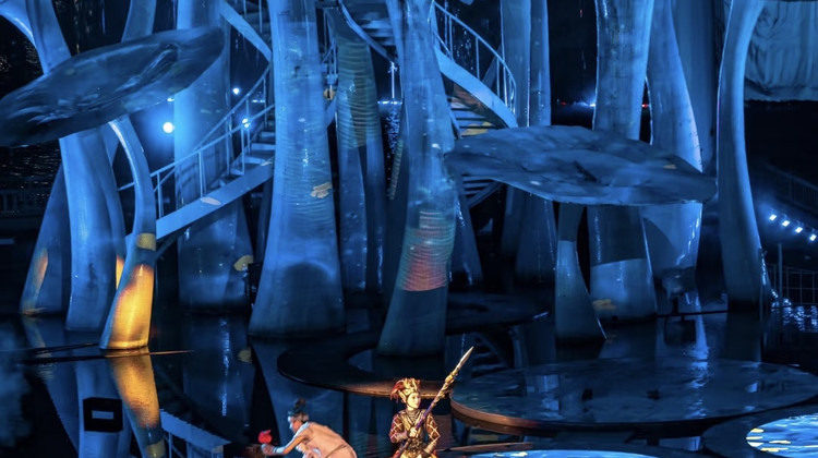 水幕倾泻而下,夜晚灯光亮起,乘船夜游,仿佛梦回大唐夜宴