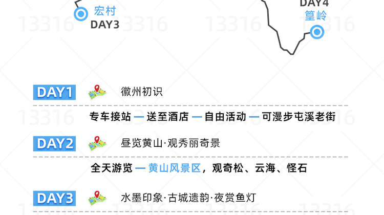 📍黄山奇观📍登临天下奇山,赏云海奇松怪石,感受”五岳归来不看山”的壮丽意境; 📍宏村画卷📍漫步南湖画桥,看月沼倒映徽韵,细品”画里乡村”的水墨意境,百览不厌; 📍呈坎玄妙📍漫步千年八卦古村,白墙青瓦错落有致,感悟”人间太极”的玄妙布局; 📍篁岭晒秋📍登临崖上古村,看五彩作物点缀梯田瓦檐,邂逅民俗晒秋画卷; 📍徽州古城📍走进徽州,参观徽州府衙,”徽学”发祥地,感受徽州;