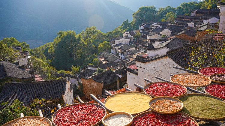 挂在山崖上的篁岭古村,地无三尺平,数百年来,村民早已习惯用平和的心态与崎岖的地形“交流”,绘就出了一处“晒秋人家”风情画。