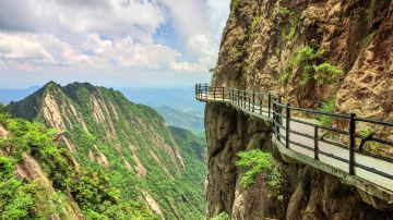 三清山风景区位于上饶市东北部,有“小黄山”之称,因三清山-玉京峰、玉虚、玉华峰三座山峰挺拔屹立,神似道教玉清、上清、太清三位尊神列坐在山巅之上而得名。这里是道教名山,景色也有几分仙气,能看漂亮的云海日出,欣赏山间惟妙惟肖的奇石,还能走上高空栈道赏景。